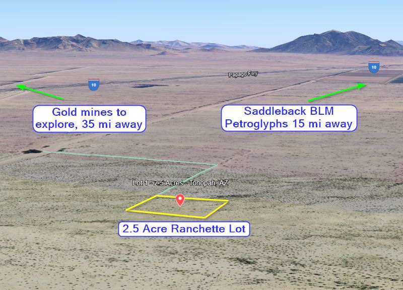 2.5 acres of land for sale in Tonopah, Arizona with legal access only 5 miles from Interstate 10, 15 miles to Saddleback BLM Petroglyphs and 70 miles to Phoenix, mostly freeway driving. This square 330′ x 330′ property was recently surveyed and has visible boundary markers, it’s not in a flood plain, has no HOA, the nearest power pole is 1,600 feet away so a solar and battery configuration would be ideal, and for water you can drill a well, haul water or use a rain catchment system. Zoned RU-43 for single-family dwellings, farms, recreation, and home occupations and modular, manufactured, mobile homes, site-built, and factory-built houses are allowed. And while you’re exploring, check out the old Gold Bullion, Black Rock, and Black Nugget Mines 35 miles north in Aguila, AZ. Property GPS coordinates: 33.53303, -113.22634. Contact me today for more information!