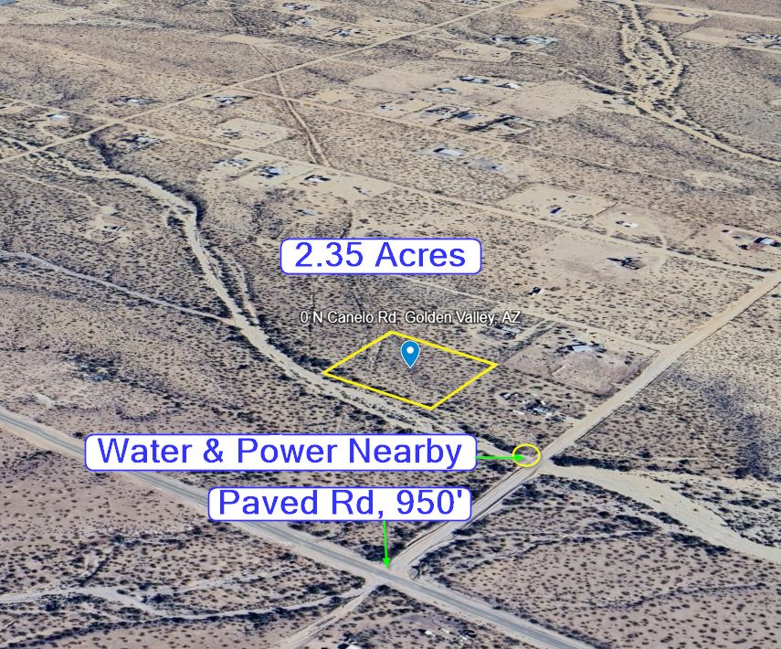 2.35 acres with no HOA and not in a flood zone just 950 FT away from a paved road that leads directly to Highway 86. Power is 340 FT away on Chinle Dr, requiring only one power pole to extend and a water line from Valley Pioneers Water Company is 455 FT away on Chinle Dr. The nearest water hauling service is Golden Valley Water Hauling and is 1 mile away if like many of the homes in this area, you choose to have water delivered. This property is on Canelo Rd and has legal access.