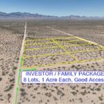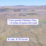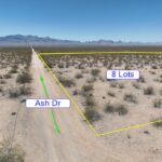 8 adjoining one-acre lots with corner access totaling 8.76 acres, great for the investor who wants to sell individually or have a larger parcel of land to develop, and perfect for friends and family that want a vacation spot next to each other for weekend camping, off-roading and hiking, with easy access 1.9 miles from paved Oatman Highway, near the Hualapai Mountains, Dead Mountain Wilderness, Colorado River, Laughlin, city of Kingman, and more. RV and travel trailers are allowed with a special permit and septic installation for full time placement. There are many water delivery services in the area and you can haul water or drill a well. There’s no power to the land so you can use a generator or add solar and battery backup for electricity, and a septic system if you plan on a more permanent residence. Place a manufactured home or tiny home, build a barndominium or other assembled permitted structures for a full time residence, rental, or weekend getaway. Or this is a great location to park an RV or trailer for weekend camping. Zoned M-AR Agricultural Residential, 4 of the 8 Lots are partially in a flood plain (see image). There is legal access from multiple directions on well-driven dirt roads and the best route is exiting Ash Dr from Oatman Highway and heading west to reach the properties. GPS (Coordinates take you to the SE lot on the corner of Ash Dr / Indian Wells Trail): 35.098510, -114.202078