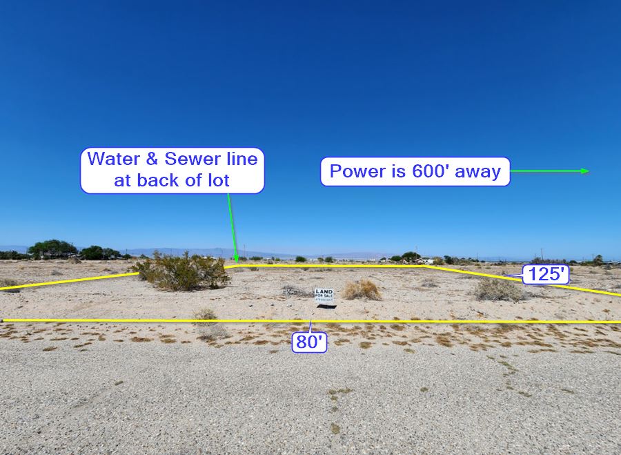 Clean 80′ x 125′ lot a half mile to the lake and 8 miles to Red Earth Casino with mountain and lake views, water and sewer service to the property line and power approximately 600 feet away at the corner of Sea Kist and Marina, making this a great investment at an affordable price in Salton City, with more lithium mining and geothermal production underway, creating new jobs in the area and supporting growth and increased property values. Palm Springs is 60 miles away and Indio is 37 miles away. This lot is has R-1 zoning allowing for a site-built house, tract home, or manufactured home on a permanent foundation.