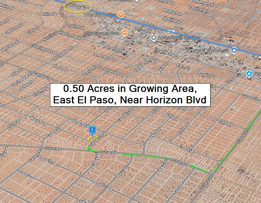 Half acre lot in a growing area just south of Horizon Blvd with road and utility expansions occurring and more development taking place in this subdivision. Located east of El Paso, there is currently no zoning so you can develop for commercial or residential purposes. There is good dirt road access to this property 1.5 miles from Horizon Blvd. This half acre lot is 7 miles to the commercial center of Horizon City for gas, groceries, banking, restaurants and retail and there is new development and growth underway in the East El Paso area. This lot is not zoned and you can use it for residential and / or commercial purposes, such as running a business and having a home on the land. There is no power or water service to this part of the subdivision yet so plan on using a generator or setting up solar, and hauling water for any development. The land is not in a flood zone and there is no HOA. GPS coordinates to the property: 31.667724, -106.104566